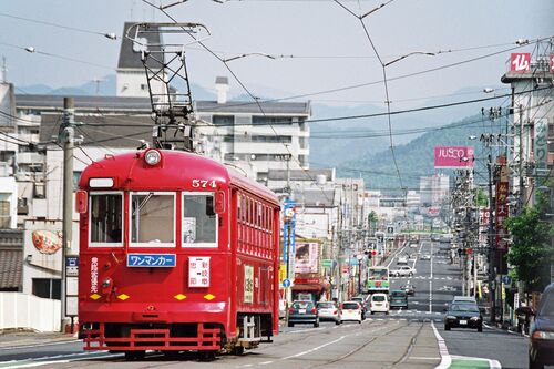 2004年4月29日 忠節へ向かうモ574号。はめ込み式のヘッドライトが特徴。 戦後、帝国車両が制作した都電6000形のコピーは多数の事業者で新製されました。丸みを帯びた形状に正面3枚窓で構成されたデザインは、全国の路面電車の顔として親しまれました。 名鉄5…